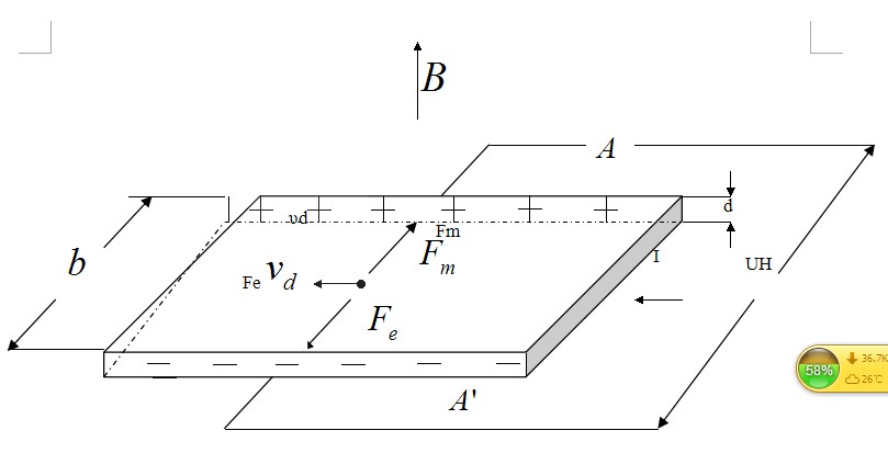 所謂霍爾效應:相當于把一塊寬為b,厚為d的導電板放在磁感應強度為B的磁場中,并在導電板中通以縱向電流I ,此時在板的橫向兩側面A、A′,之間就呈現出一定的電勢差,這一現象稱為霍爾效應,所產生的電勢差UH稱霍爾電壓。高斯計就是利用這一原理來測量磁場強度的。如圖所示: